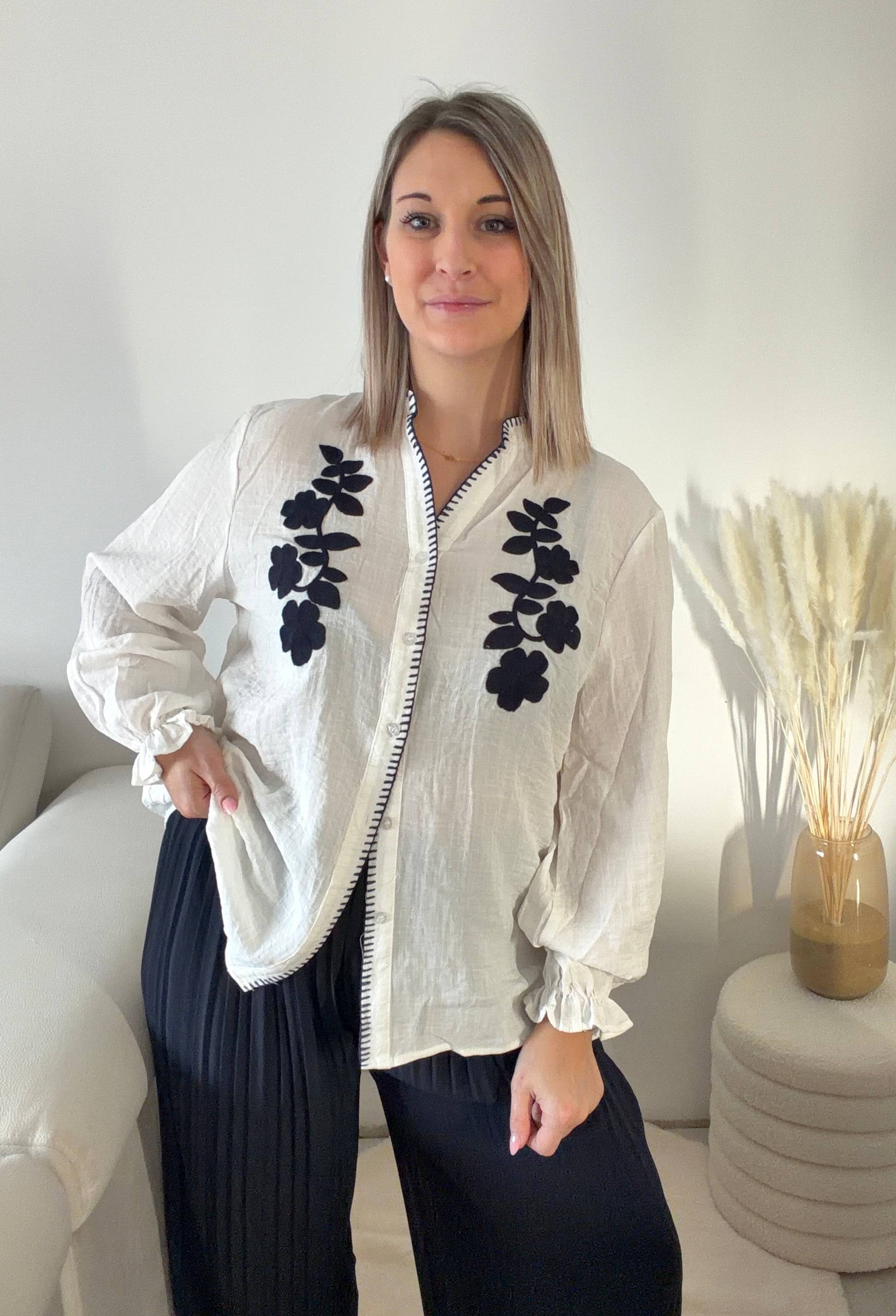 Apportez fraîcheur et élégance à vos tenues avec cette chemise brodée 100% coton, légère et agréable à porter. La chemise se distingue par une broderie bleu marine délicat, formant un liseré sur le col et au niveau des boutons sur le buste, pour une touche raffinée et moderne. Idéale pour le printemps et l’été, elle combine confort, style et détails soignés pour un look chic et estival.