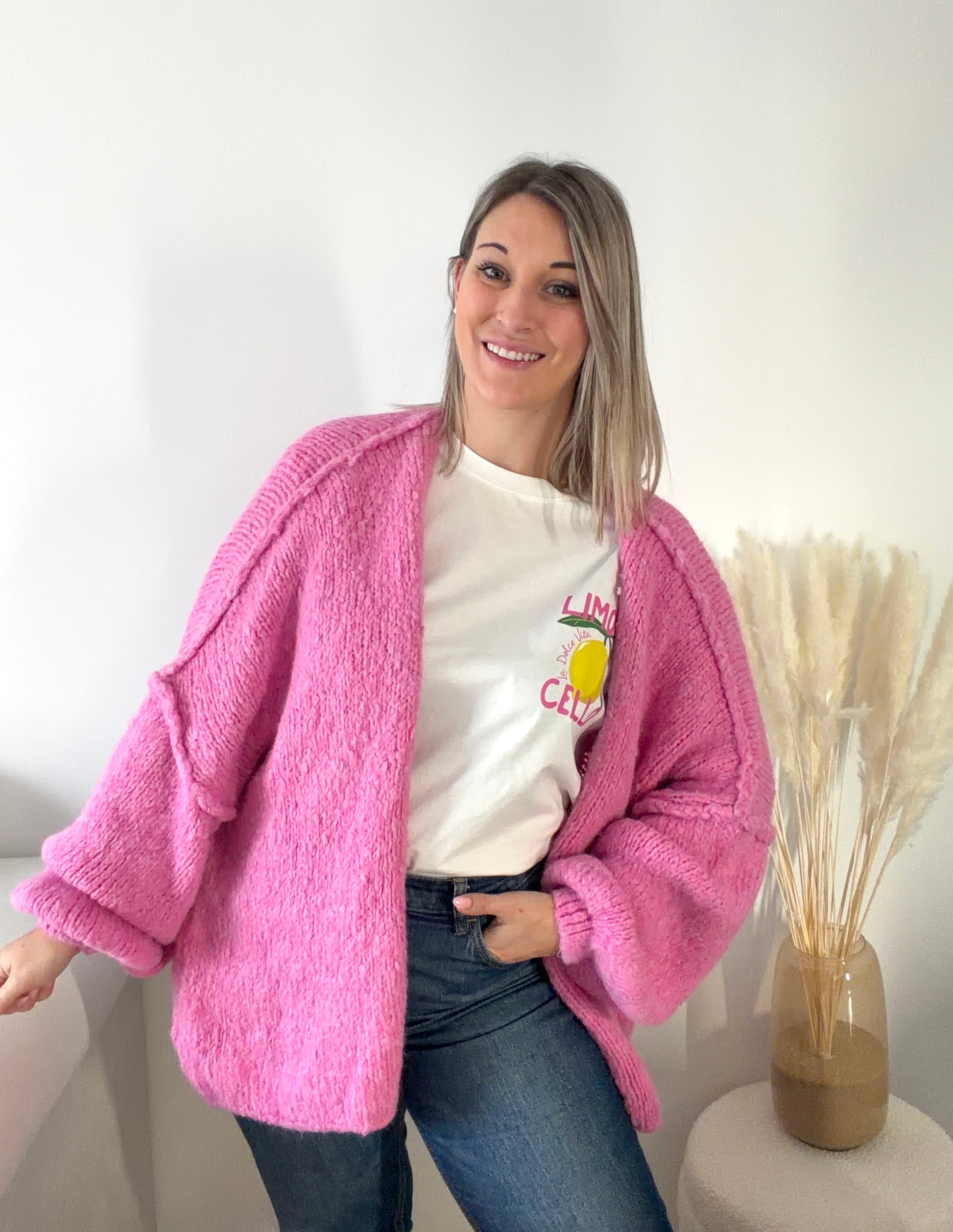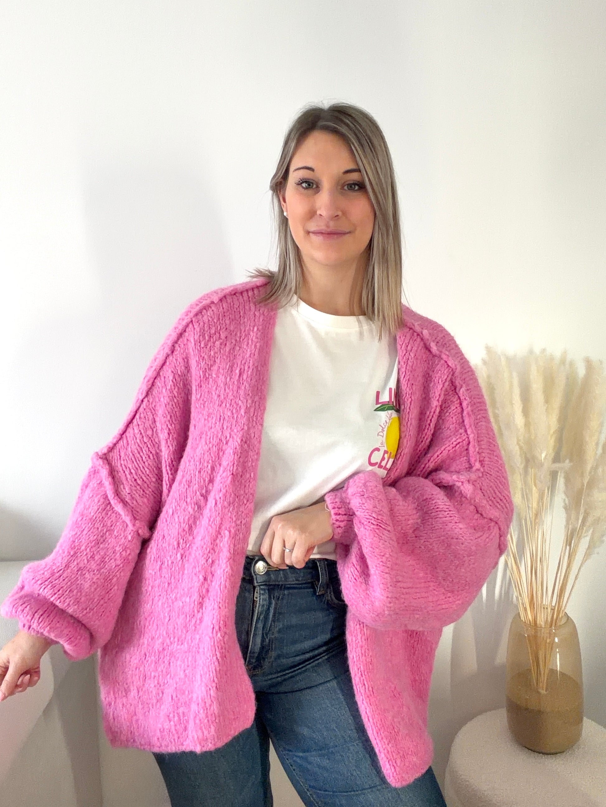 Portez ce gilet avec un jean clair et un t-shirt blanc pour un look casual lumineux, ou sur une robe fluide écrue avec des bottines pour une silhouette féminine et moderne. Le rose s’accorde parfaitement avec le blanc, le denim et le beu.