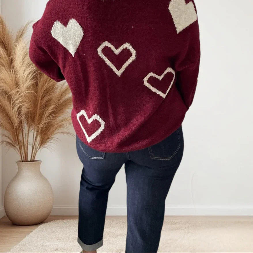 Apportez une touche fun et romantique à votre garde-robe avec ce gilet bordeaux orné de motifs cœurs blancs. Sa maille douce et ses manches légèrement bouffantes en font une pièce à la fois confortable et pleine de style.