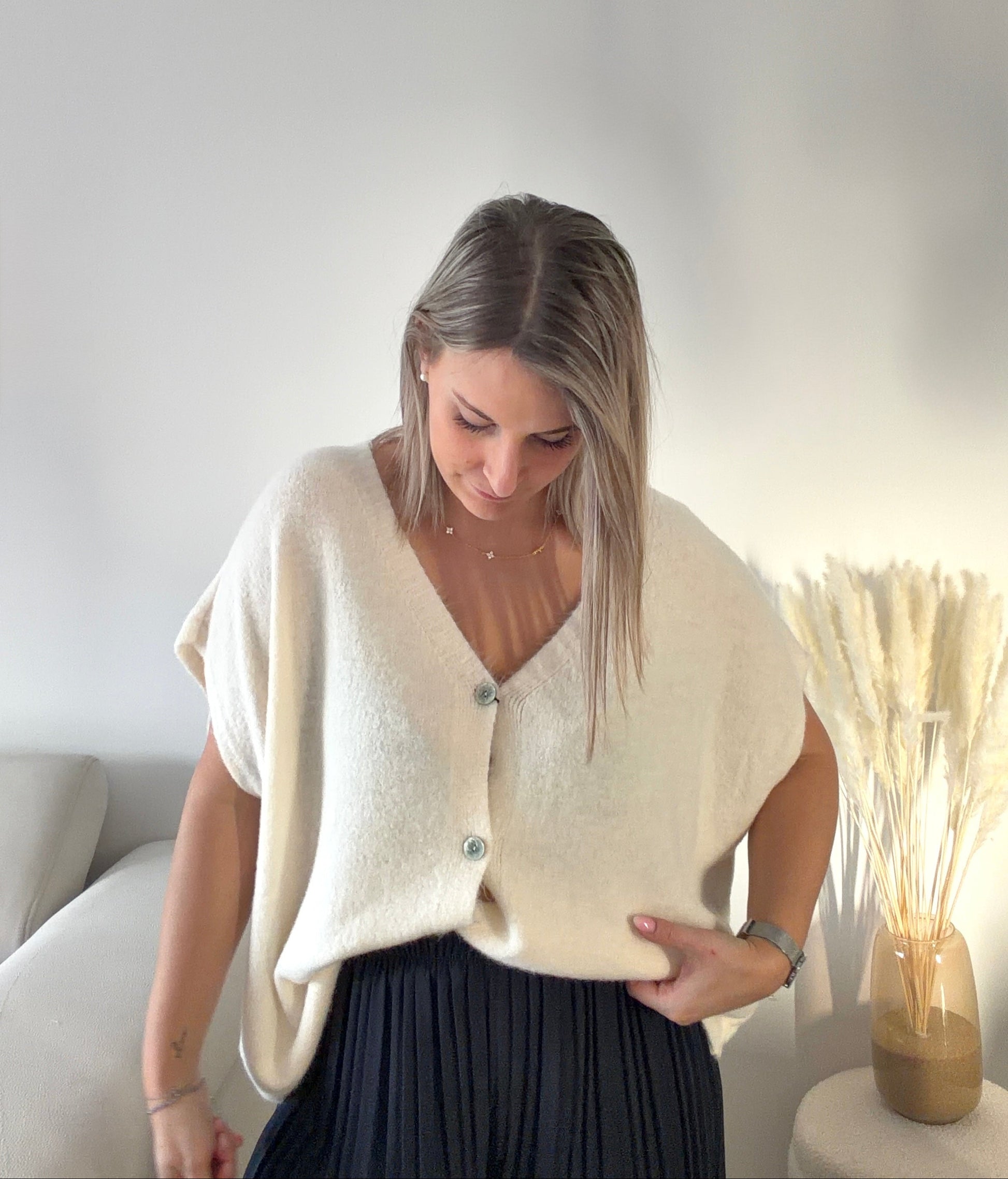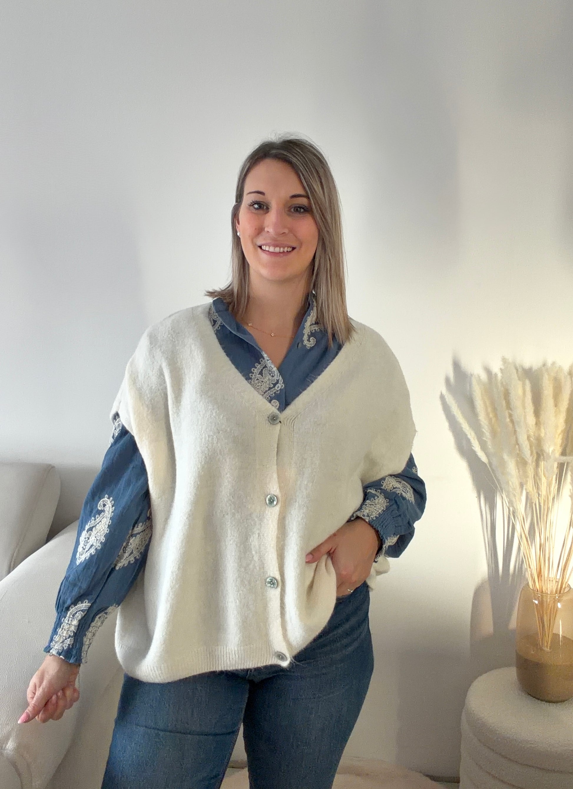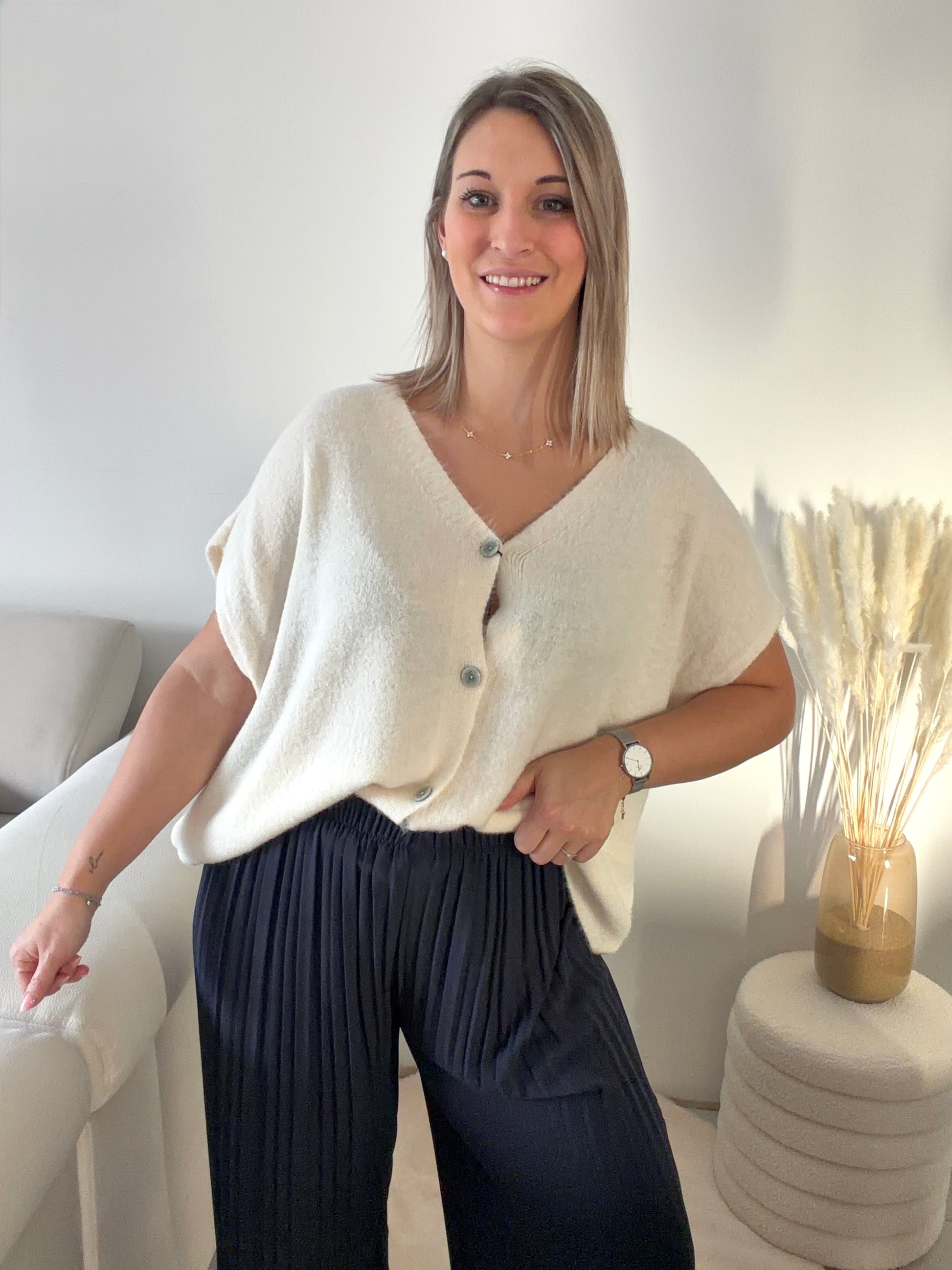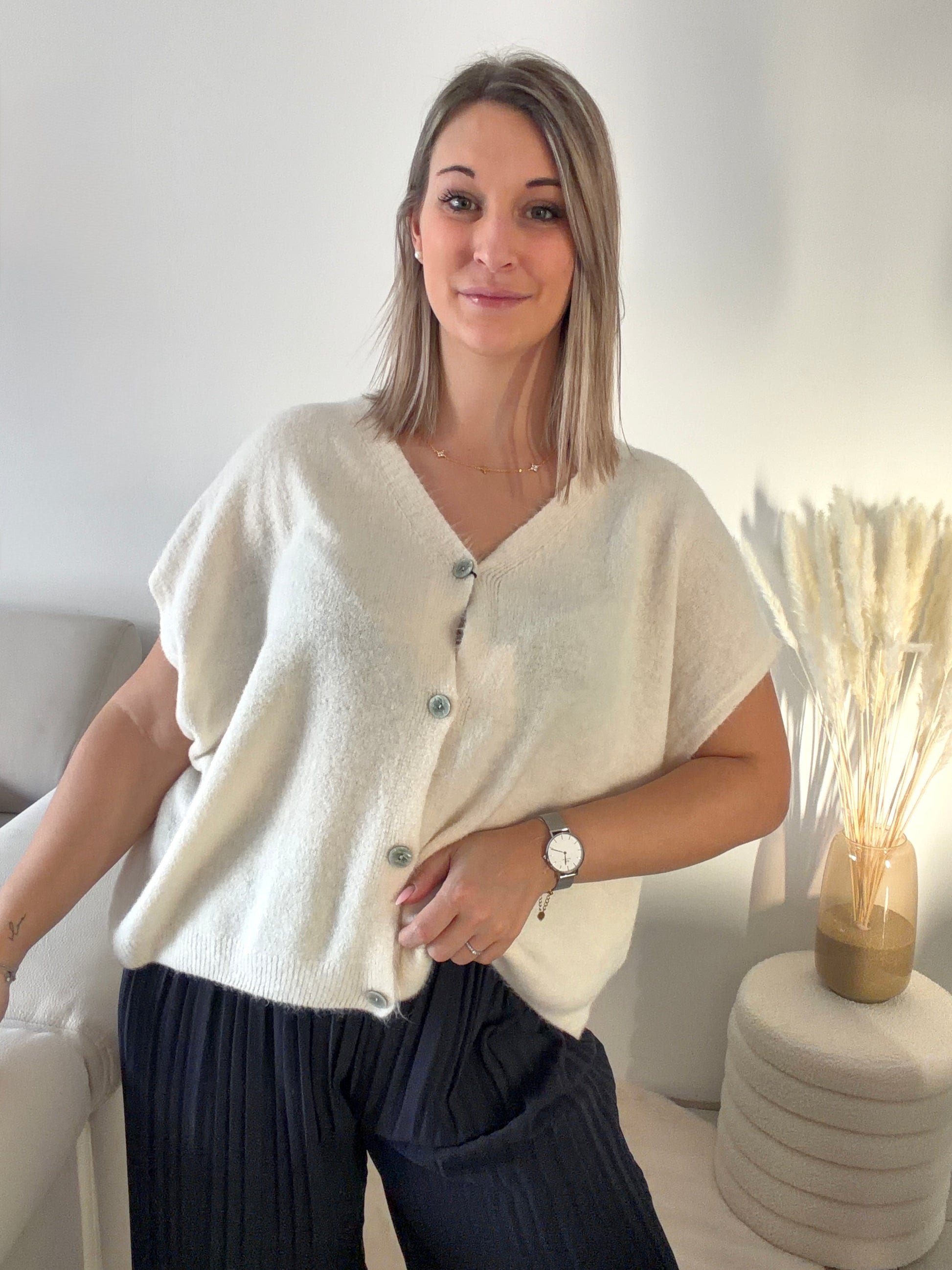 Adoptez un style chic et décontracté avec ce gilet sans manches oversize écru tendre. Parfait pour le printemps, sa coupe ample et fluide apporte confort et modernité, tandis que ses boutons élégants ajoutent une touche raffinée.
