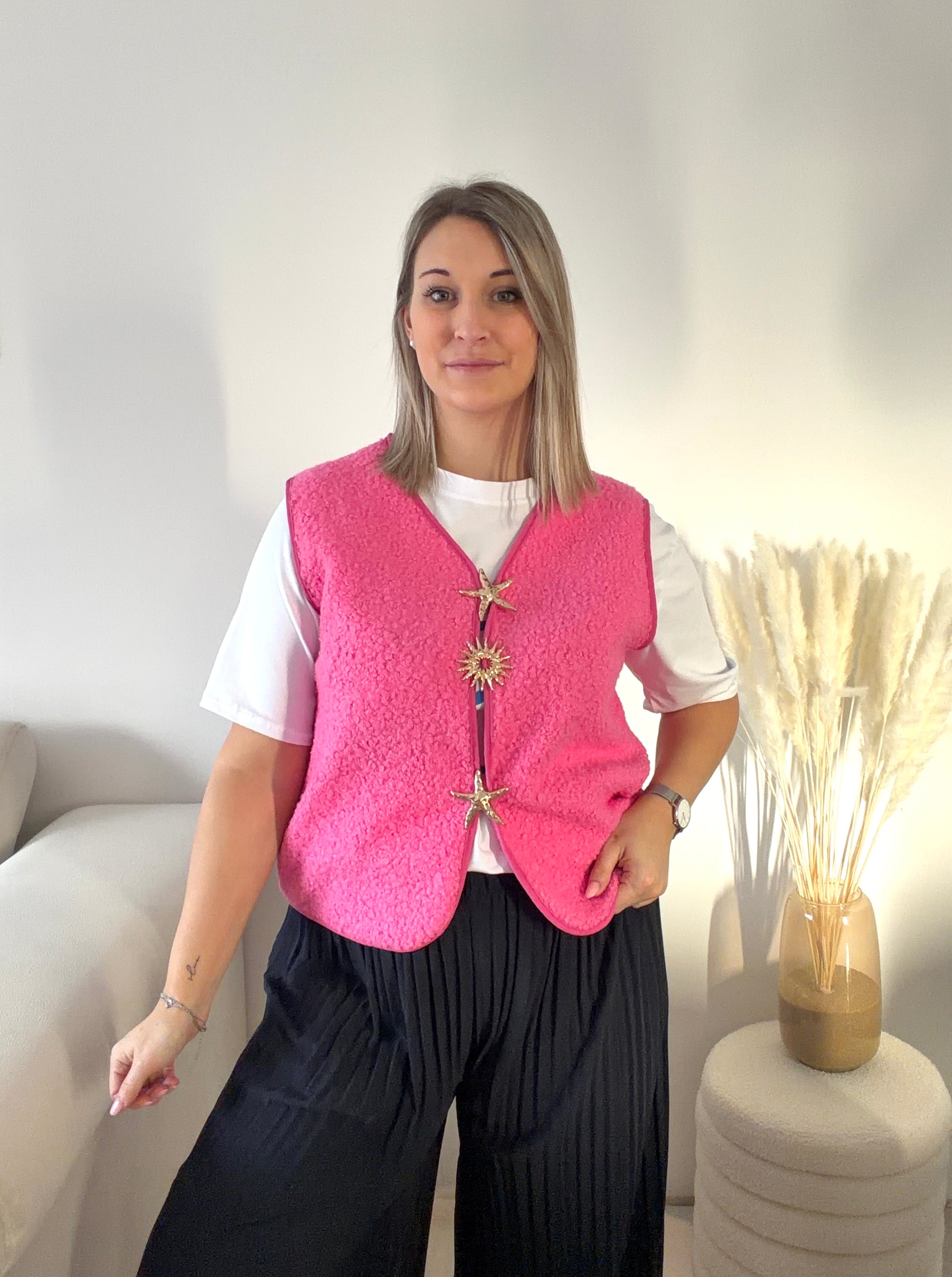 Apportez une touche de douceur et d’originalité à votre tenue avec ce gilet sans manches rose au style féminin et lumineux. Ses bijoux décoratifs en forme de soleil et d’étoile à l’avant ajoutent une note chic et brillante, parfaite pour sublimer une silhouette simple.