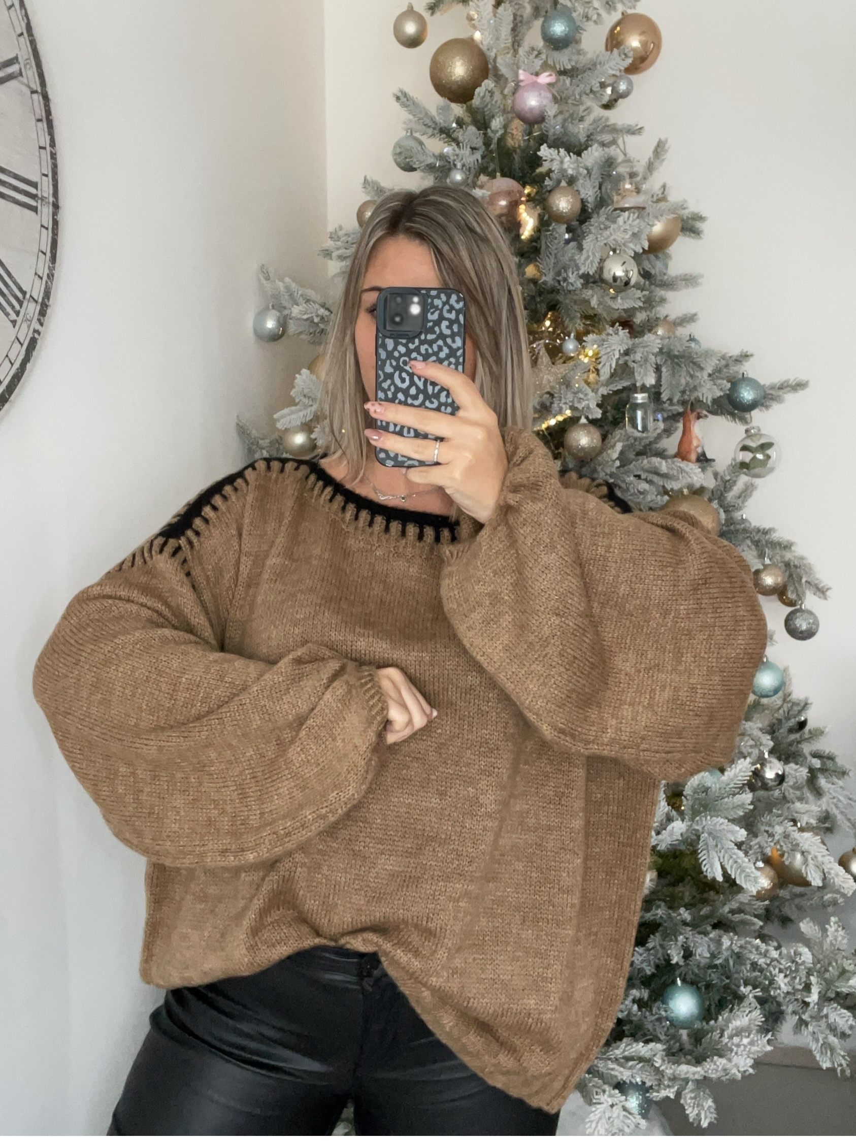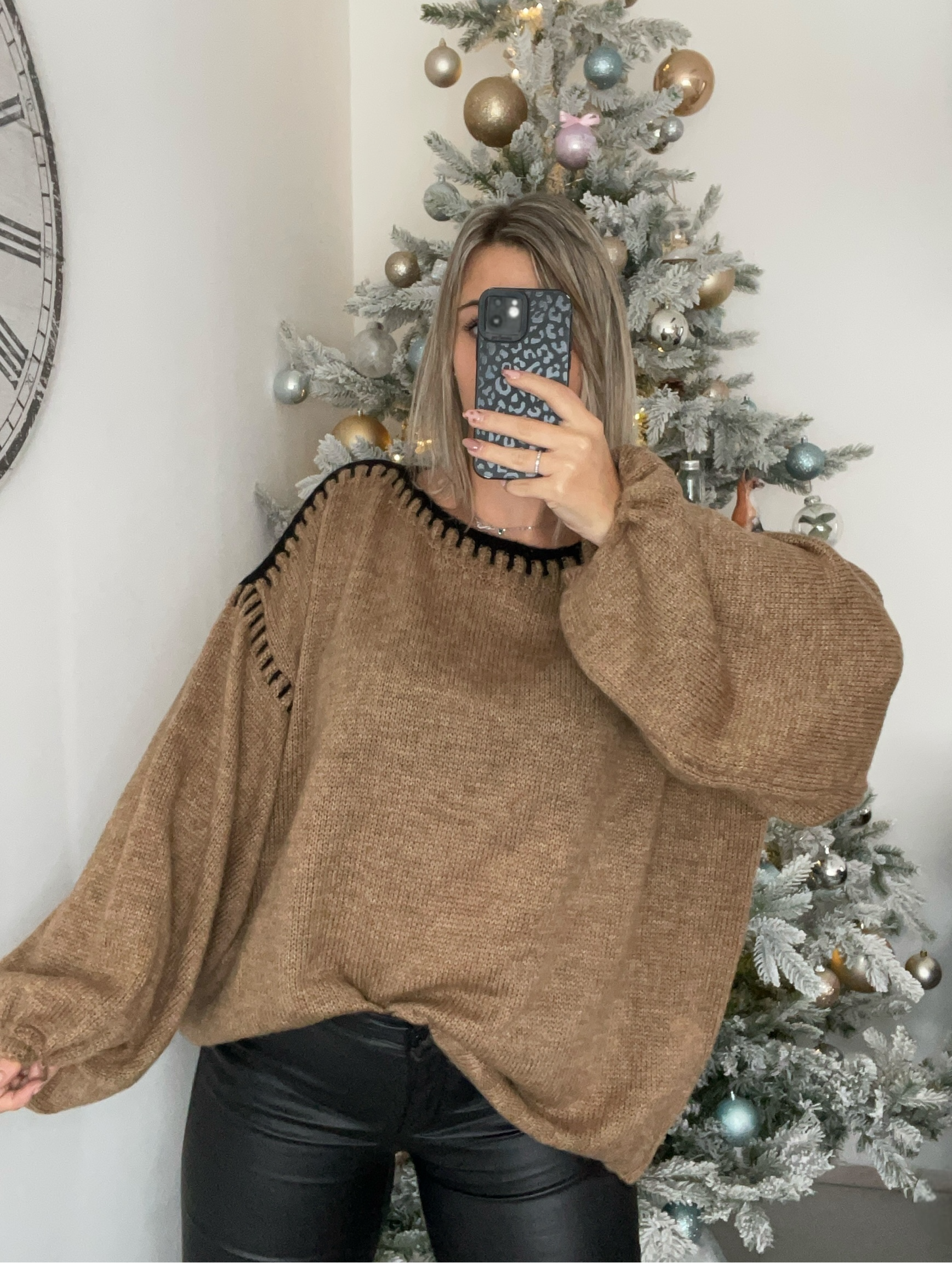 Adoptez un look tendance et cosy avec notre pull taupe à détails contrastants noir. Sa coupe ample et sa maille douce en font la pièce idéale pour vos journées décontractées comme pour vos sorties stylées.