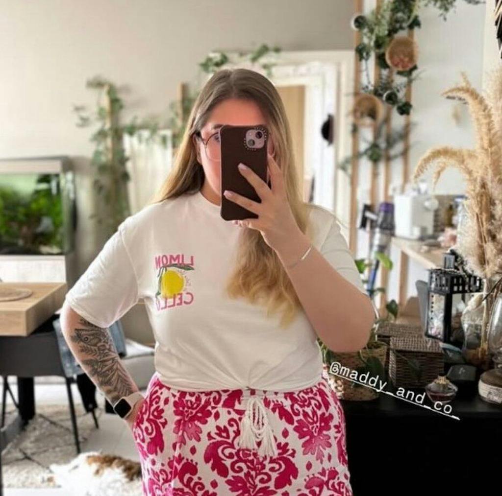 Craquez pour ce T-shirt oversize blanc orné de l’inscription « Lemon Cello » rose et son citron, parfait pour un look à la fois simple, moderne et tendance. Sa coupe ample assure un confort optimal et une grande liberté de mouvement, tandis que sa matière douce en coton le rend idéal pour la saison printemps/été.