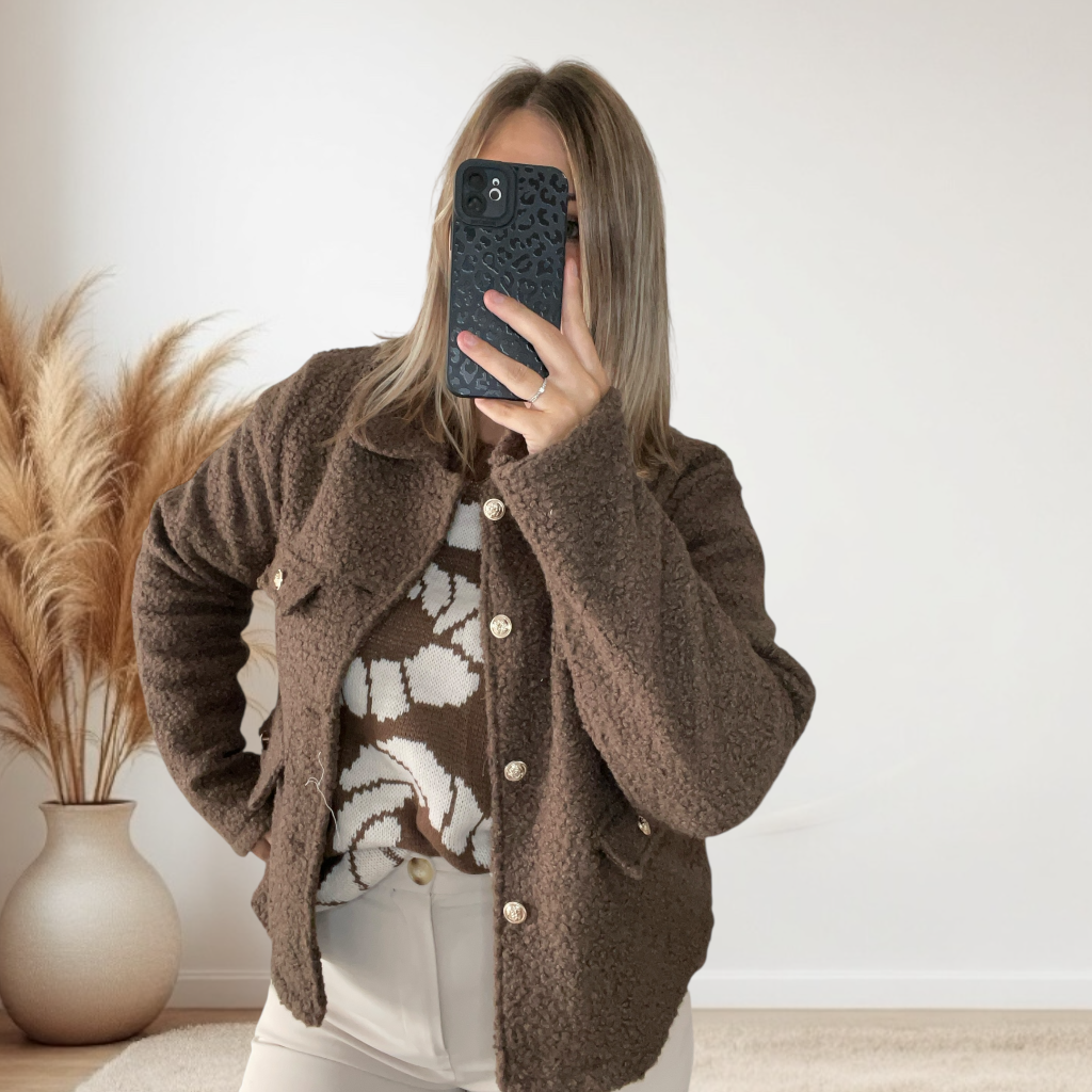 Apportez une touche chic et décontractée à vos looks avec cette veste bouclée marron. Conçue dans une matière douce et chaleureuse, elle offre un confort optimal tout en restant élégante.