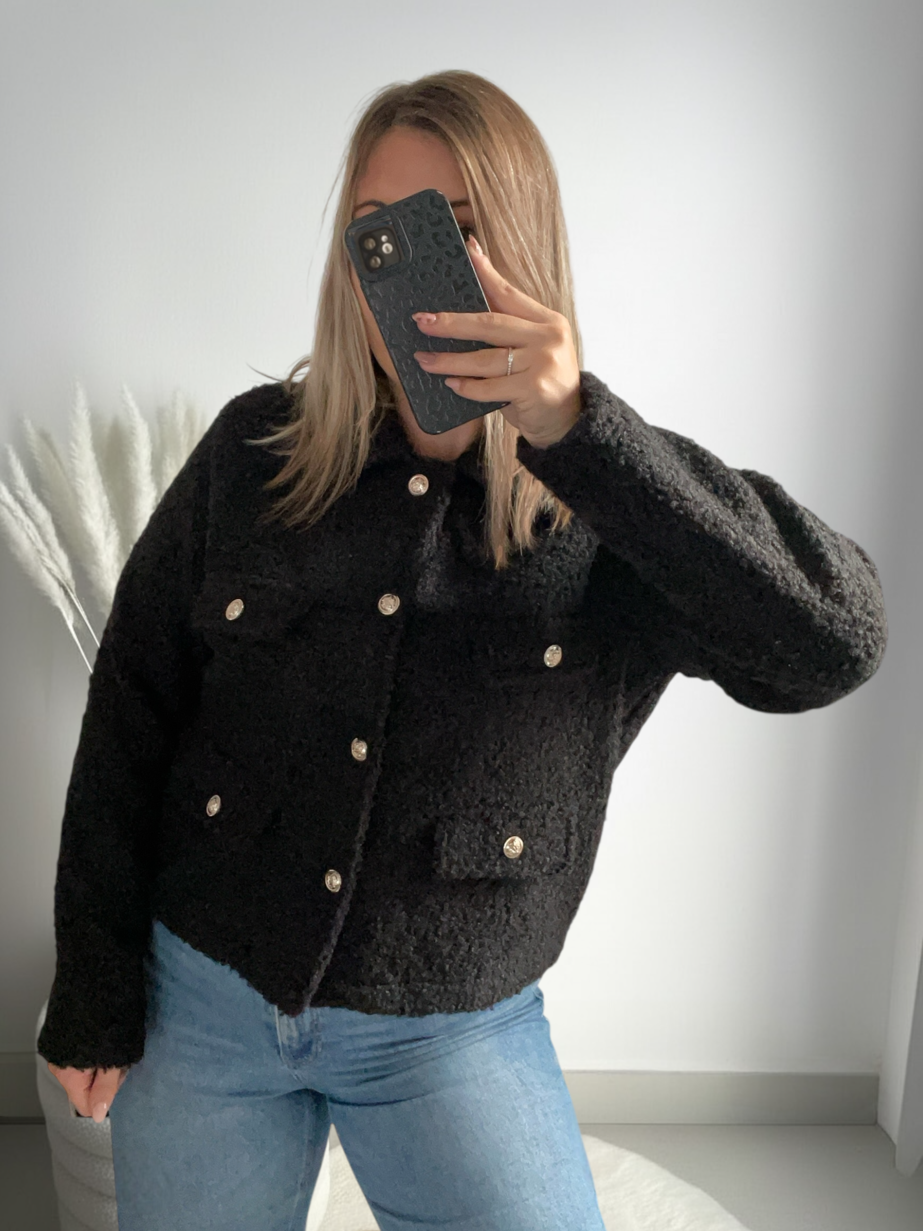 Apportez une touche chic et décontractée à vos looks avec cette veste bouclée noir. Conçue dans une matière douce et chaleureuse, elle offre un confort optimal tout en restant élégante.